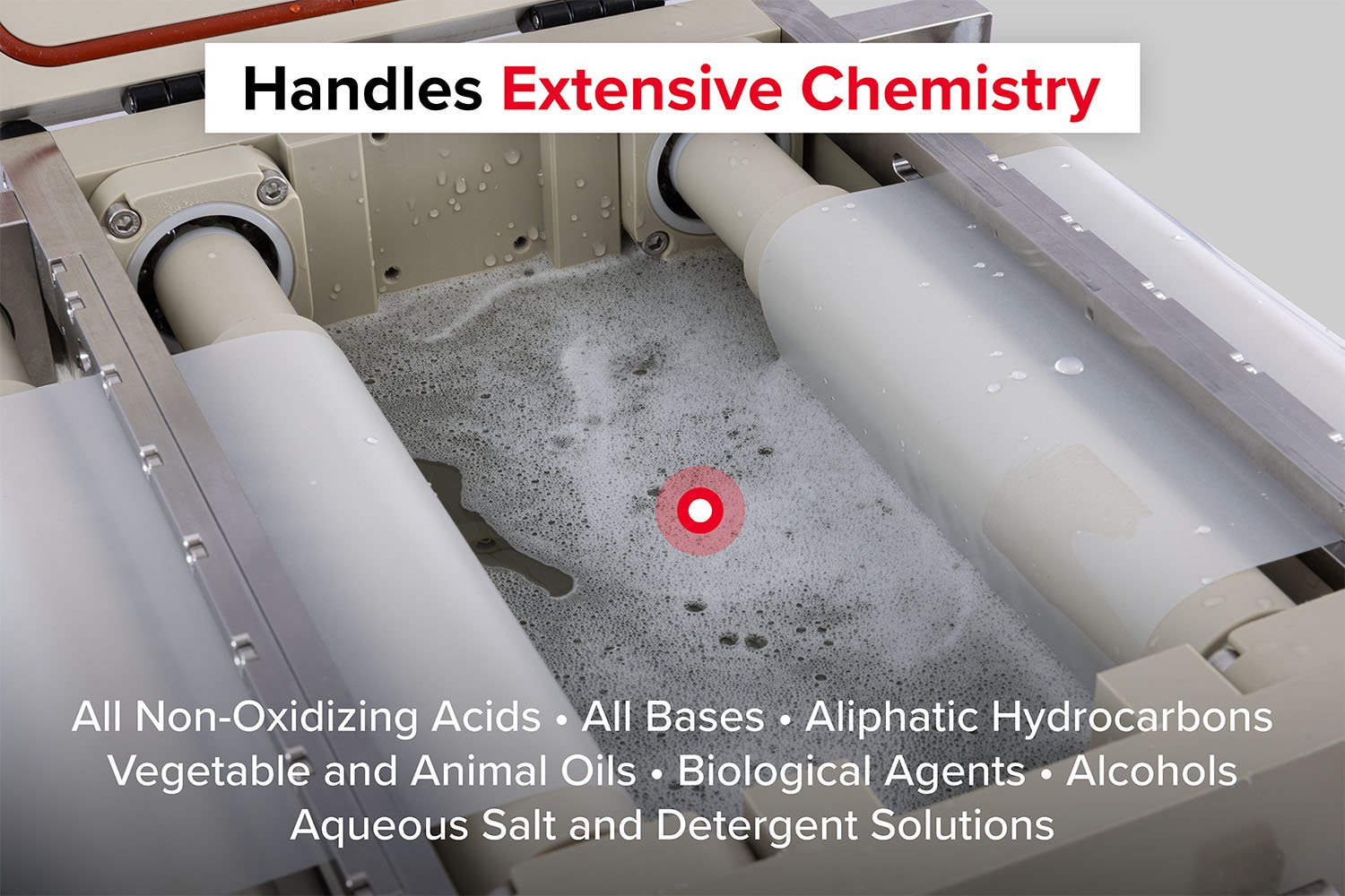 Closed-system operation ensures zero solvent or liquid emissions. Double-sided air knives enable rapid drying, and high-quality plastics, ceramics, and stainless steel (316L) ensure long-lasting chemical resistance.